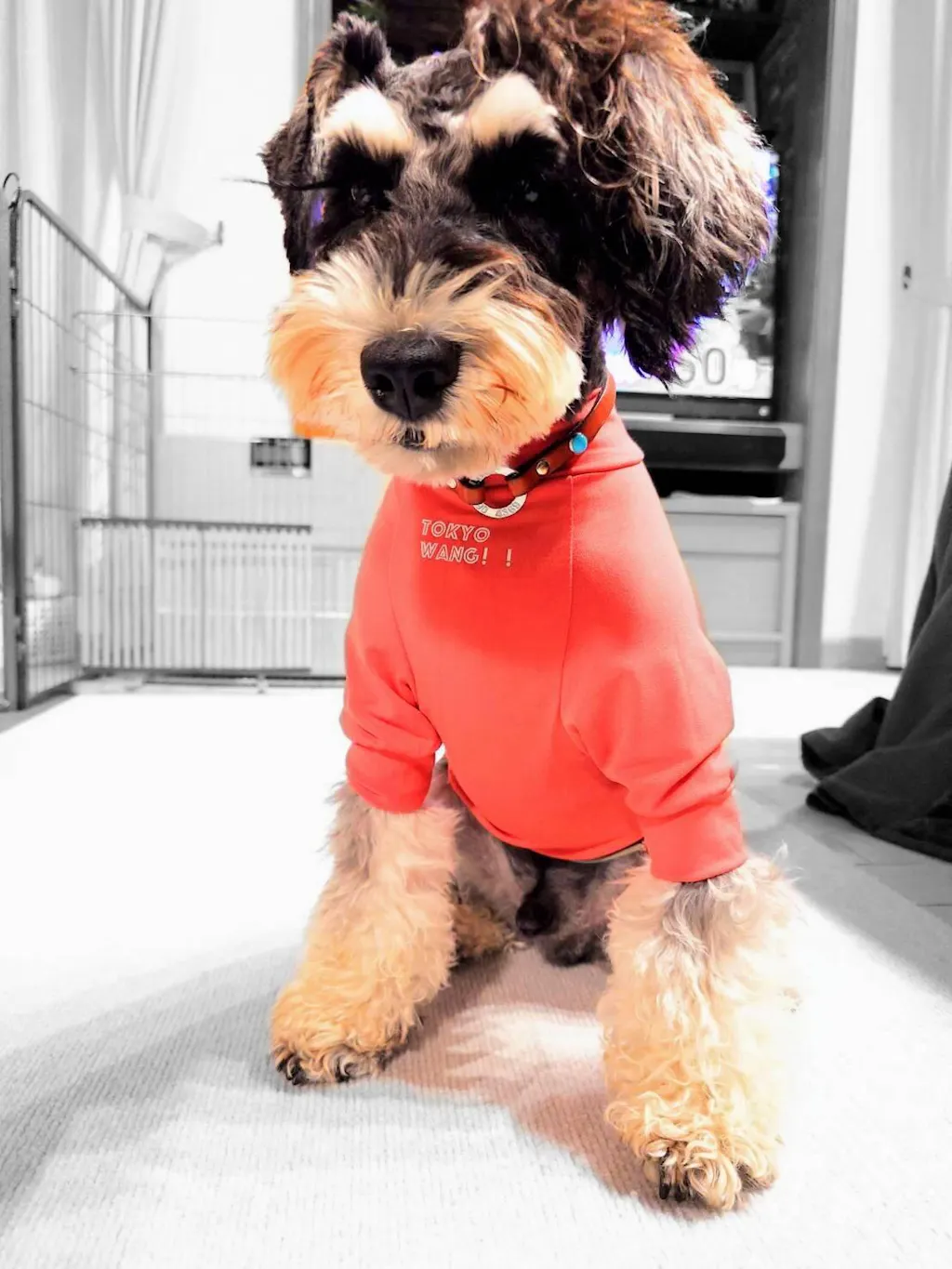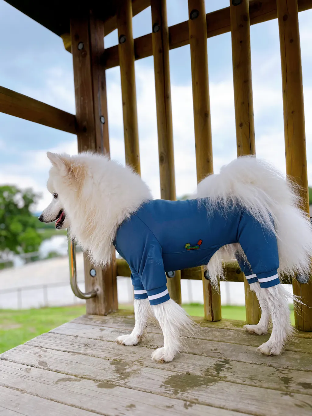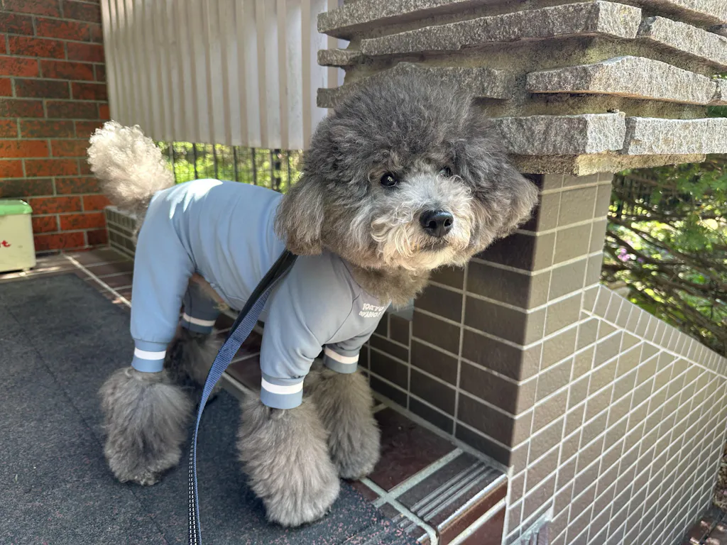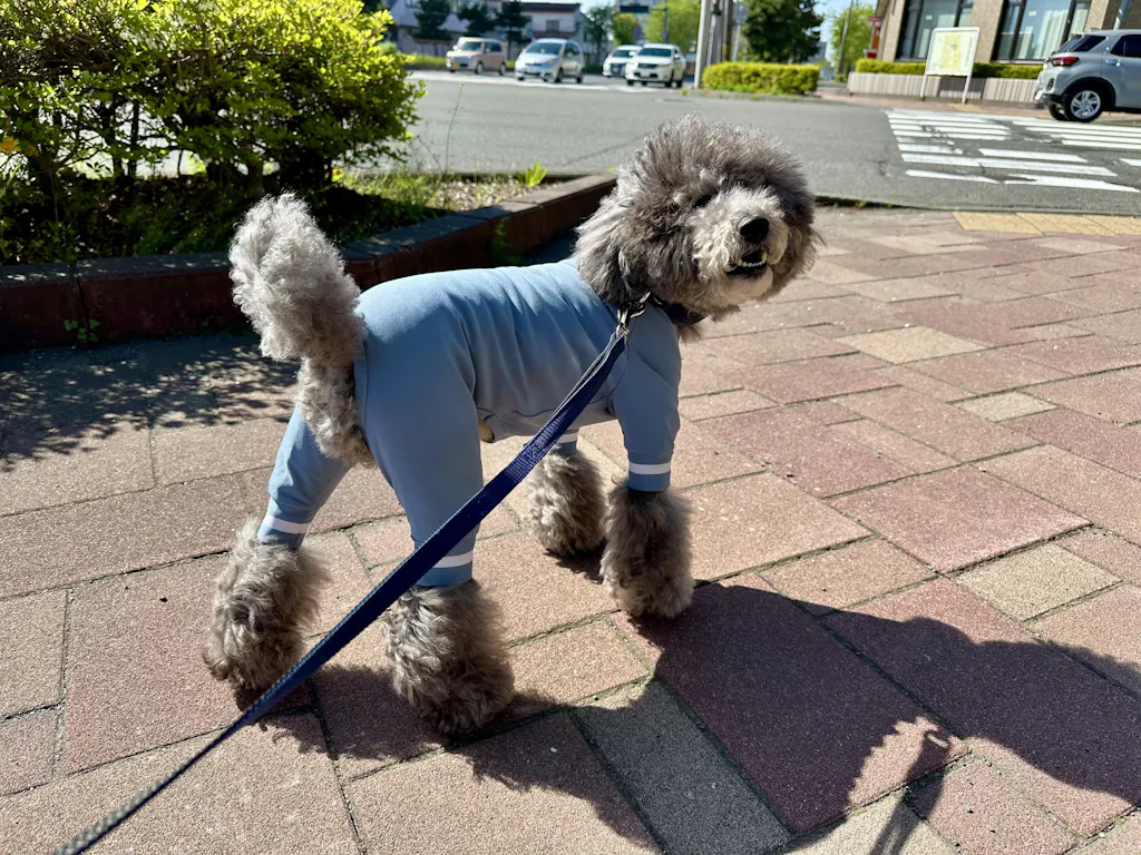 とってもかっこよく、UVカットで15歳の老犬の肌にも優しい