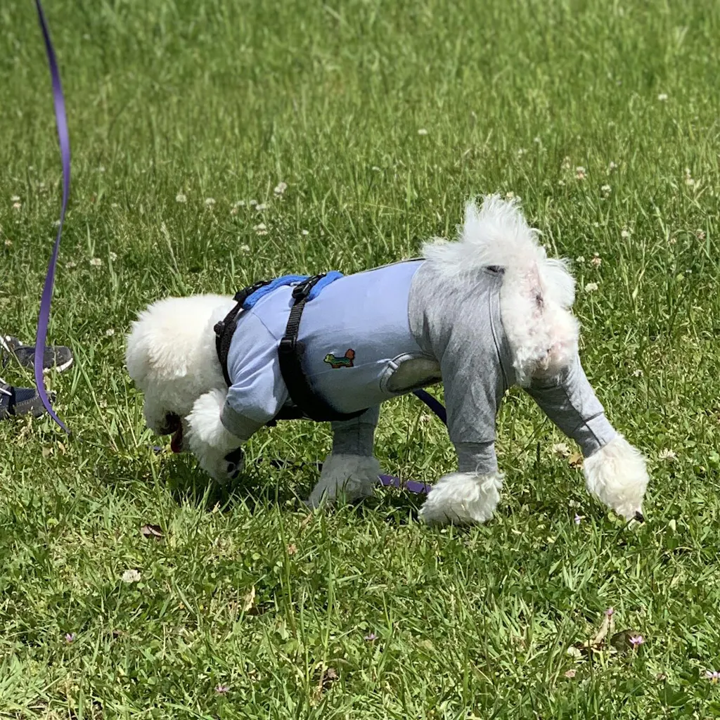 うちの子は普段から洋服を着用しているので慣れていますが、ロンパースは苦手です。こちらのロンパースは生地が上質でストレッチもよくきいているので、脱ぎ着が楽で、着用時も全く嫌がりません。お散歩も楽しそうでした!